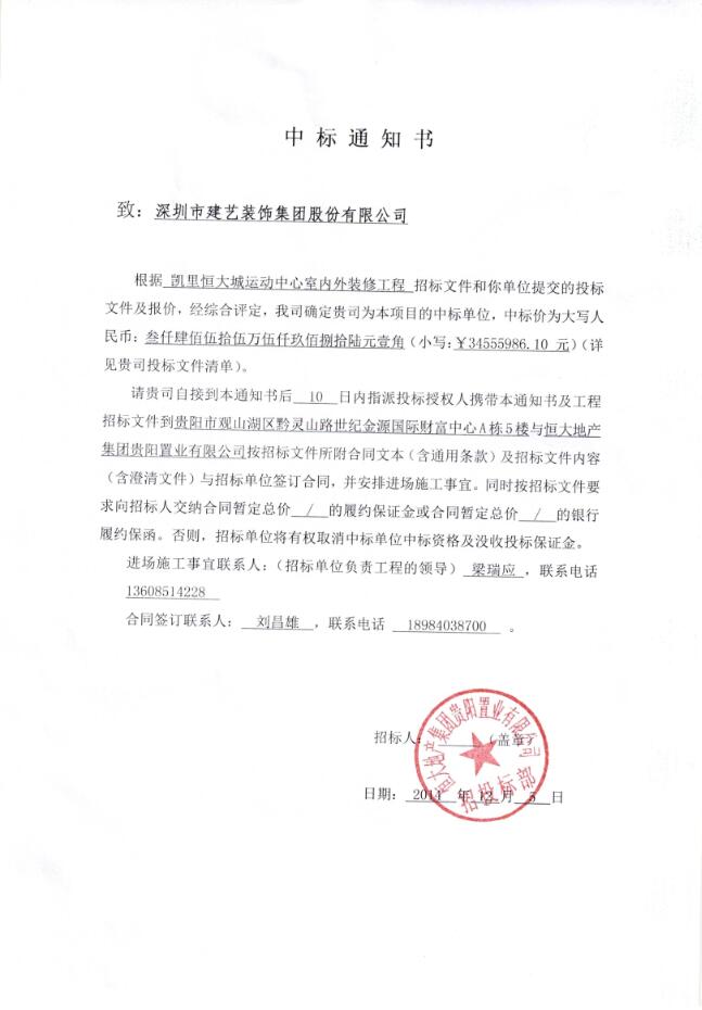 【喜訊】:凱里恒大城運動中心室內(nèi)外裝修工程中標