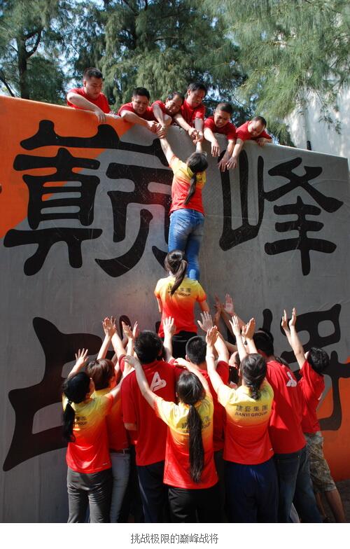 當教練宣布完挑戰(zhàn)規(guī)則后,建藝人集體陷入沉思,在大家的心中都有這樣一個疑問:單憑“人墻”,我們能完成挑戰(zhàn)嗎?看到蔓延在團隊中的顧慮陰霾,作為本次挑戰(zhàn)領隊的集團常務副總裁田力與共同參加挑戰(zhàn)的行政管理中心總監(jiān)趙紂瑜共同制定了挑戰(zhàn)策略,并在最短時間內將隊伍分工,確定人墻人員及攀爬人員,通過對團隊資源的合理分配,迅速調整了團隊成員們的心理狀態(tài)?!拔覀円欢艹晒?!”的堅定信念更是將先前的顧慮陰霾一掃而光。在教練一聲令下后,第一名攀爬人員在人墻的幫助下迅速爬上墻壁,打響了這場終極挑戰(zhàn)的第一槍!