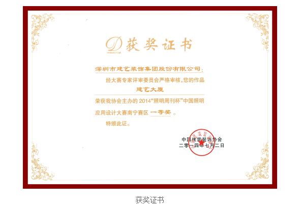 7月2日,由中國建筑裝飾協(xié)會及中國建筑裝飾與照明設(shè)計(jì)師聯(lián)盟共同主辦的“2014(第六屆)‘照明周刊杯’中國照明應(yīng)用設(shè)計(jì)大賽南寧賽區(qū)頒獎典禮”在廣西錦華大酒店隆重舉行。建藝集團(tuán)的參賽作品《建藝大廈》憑借著一流的設(shè)計(jì)思維與應(yīng)用理念,得到了評選專家的一致青睞,最終拔得頭籌,榮獲南寧賽區(qū)一等獎,成為本次頒獎典禮上最“耀眼”的照明應(yīng)用設(shè)計(jì)優(yōu)秀典范作品。