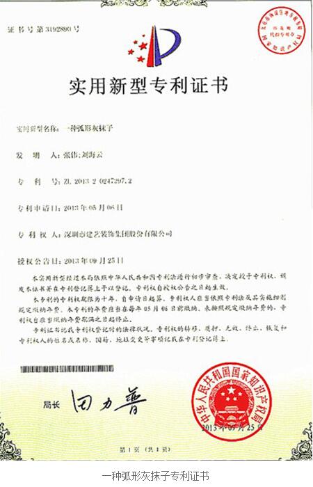 近日,建藝集團研發(fā)的二項實用新型專利正式獲得國家知識產(chǎn)權(quán)局的授權(quán)。該二項專利為:一種弧形灰抹子(專利號:ZL201320247297.2)、一種雙層輕鋼龍骨隔音墻(專利號:ZL201320369064.X)。