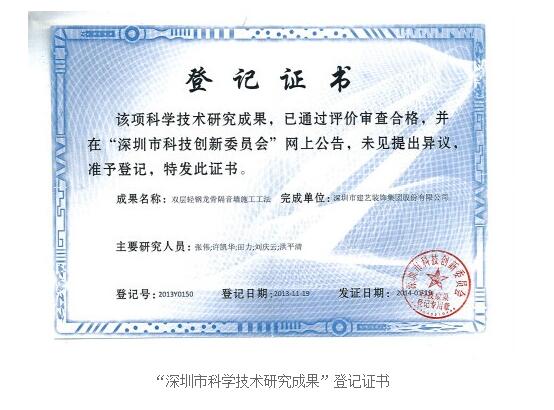 日前,建藝集團研發(fā)的“雙層輕鋼龍骨隔音墻施工工法”順利通過深圳市科技創(chuàng)新委員會的評價審查,獲得“深圳市科學(xué)技術(shù)研究成果”登記證書。