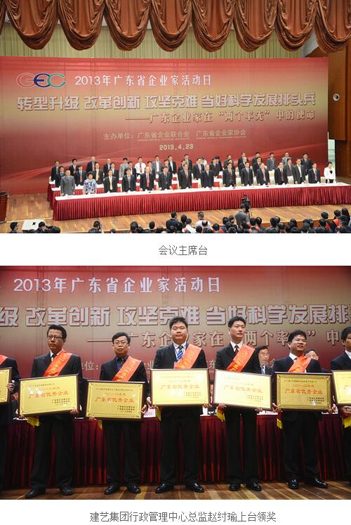 4月23日上午,由廣東省企業(yè)聯(lián)合會(huì)、企業(yè)家協(xié)會(huì)主辦的“2013年廣東省企業(yè)家活動(dòng)日”在廣州白云國際會(huì)議中心舉行。中共中央政治局委員、廣東省委書記胡春華親切接見受表彰的2012年度廣東省優(yōu)秀企業(yè)、優(yōu)秀企業(yè)家、最佳誠信企業(yè)、創(chuàng)建學(xué)習(xí)型企業(yè)十佳單位代表,建藝集團(tuán)行政管理中心總監(jiān)趙紂瑜參加了此次會(huì)議。在表彰大會(huì)上,建藝集團(tuán)分別榮獲“廣東省優(yōu)秀企業(yè)”和“廣東省誠信示范企業(yè)”兩大殊榮。