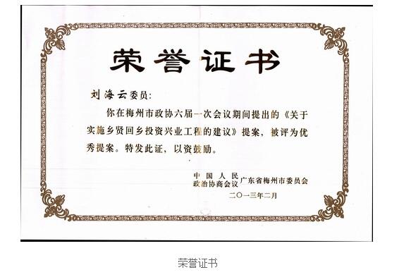 會(huì)議期間,劉海云董事長(zhǎng)提出了《關(guān)于實(shí)施鄉(xiāng)賢回鄉(xiāng)投資興業(yè)工程的建議》提案。該提案對(duì)鄉(xiāng)賢回鄉(xiāng)投資興業(yè)工程提出了多個(gè)操作性強(qiáng)的意見(jiàn),被中國(guó)人民政治協(xié)商會(huì)議廣東省梅州市委員會(huì)評(píng)為優(yōu)秀提案。