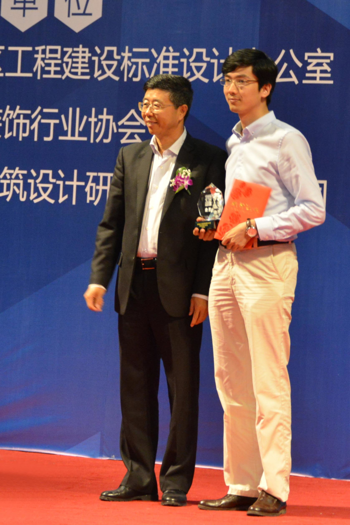 深圳市裝飾行業(yè)協(xié)會會長高剛為工藝創(chuàng)新金獎獲得者、建藝集團工程總監(jiān)韓佛(右)頒獎并合影